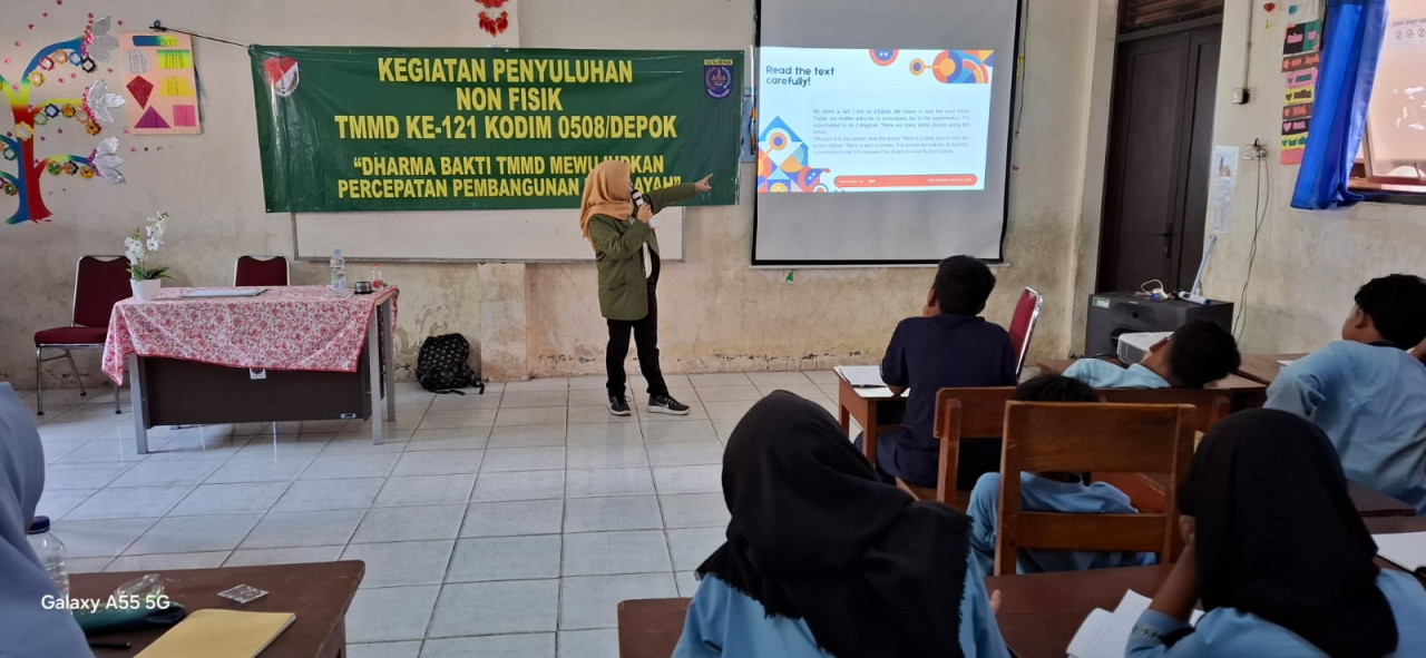 Dalam sambutannya Batituud Koramil 05/SWG Peltu Dedi Hartono mengatakan kegiatan penyuluhan non fisik TMMD ke 121 Kodim 0508/Depok, tujuan penyuluhan ini agar para siswa dan siswi memahami dan mengerti mengenai dasar-dasar bahasa Inggris dalam kehidupan sehari-hari.