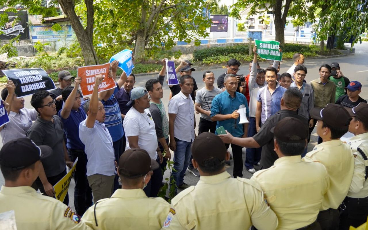 Simulasi ditutup dengan latihan pemadaman kebakaran yang diikuti oleh petugas keamanan dan pegawai.