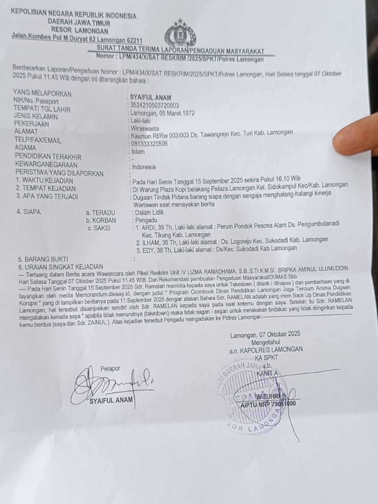 LAMONGAN - Diduga terjadi upaya penghalangan kerja jurnalistik di Kabupaten Lamongan. Kasus ini menimpa jurnalis media online memorandumdisway, Syaiful Anam, yang melaporkan adanya intimidasi dan ancaman ke pihak kepolisian.