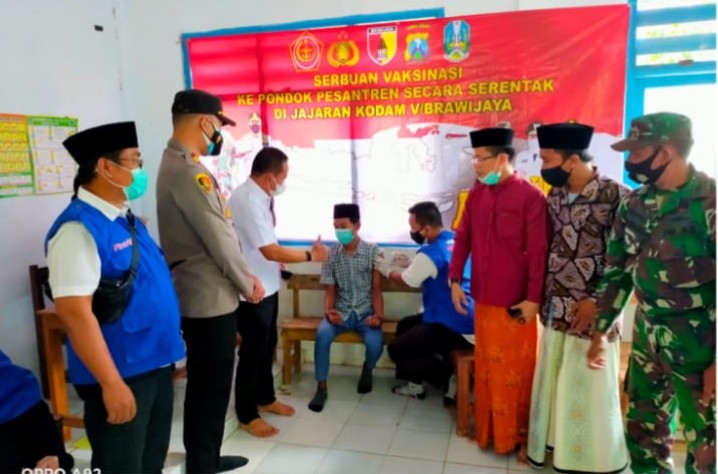 Vaksinasi merupakan hasil kerja sama antara pengasuh Pondok Pesantren Albaidhowiyah K Mahrus Ali baidhwi dengan kepala SMP Islam AL-Iman, M Syuaib.
