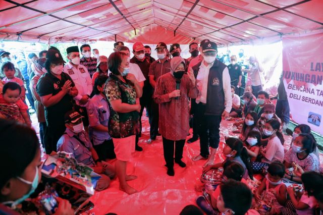 Selain menyerahkan bantuan, Risma yang ditemani Anggota Komisi VIII DPR RI M Husni dan Anggota DPD RI Dedy Iskandar Batubara dan unsur pemerintah daerah setempat menyempatkan waktu berdialog bersama korban di pengungsian.