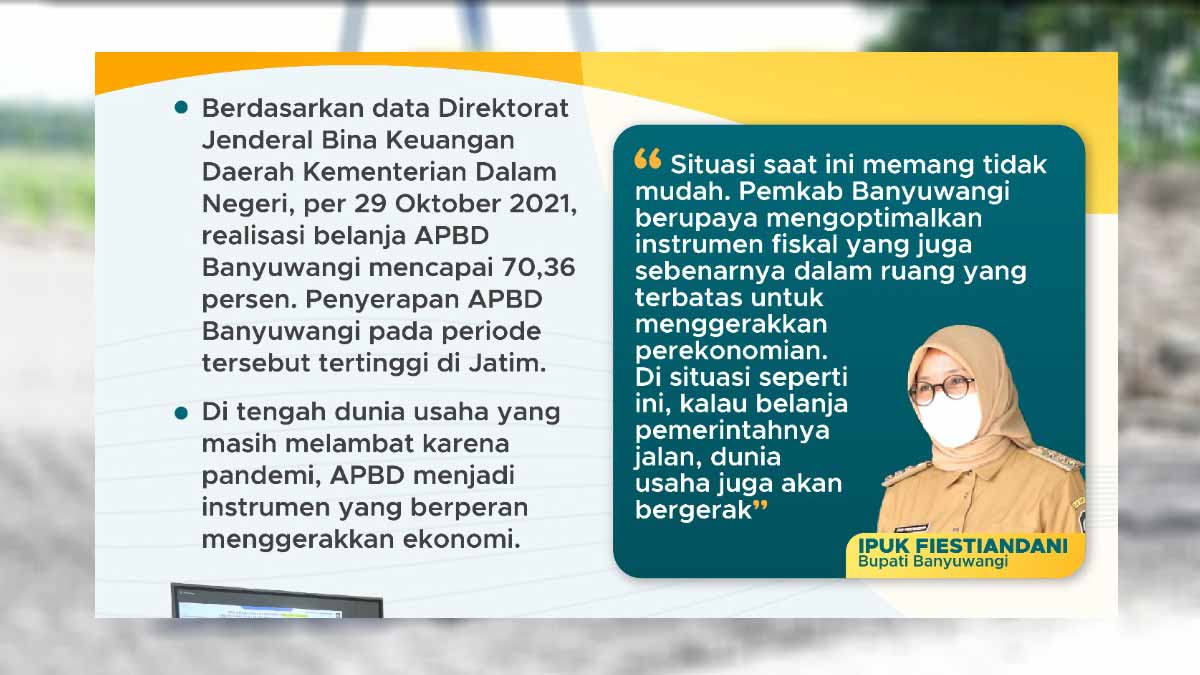 Bupati Banyuwangi, Ipuk Fiestiandani, mengatakan, pihaknya akan berupaya untuk menjaga kinerja baik dalam hal penyerapan APBD. Menurutnya, percepatan penyerapan APBD adalah untuk menjaga pergerakan ekonomi lokal. Di tengah dunia usaha yang masih melambat karena pandemi, APBD menjadi instrumen yang bisa berperan menggerakkan ekonomi.