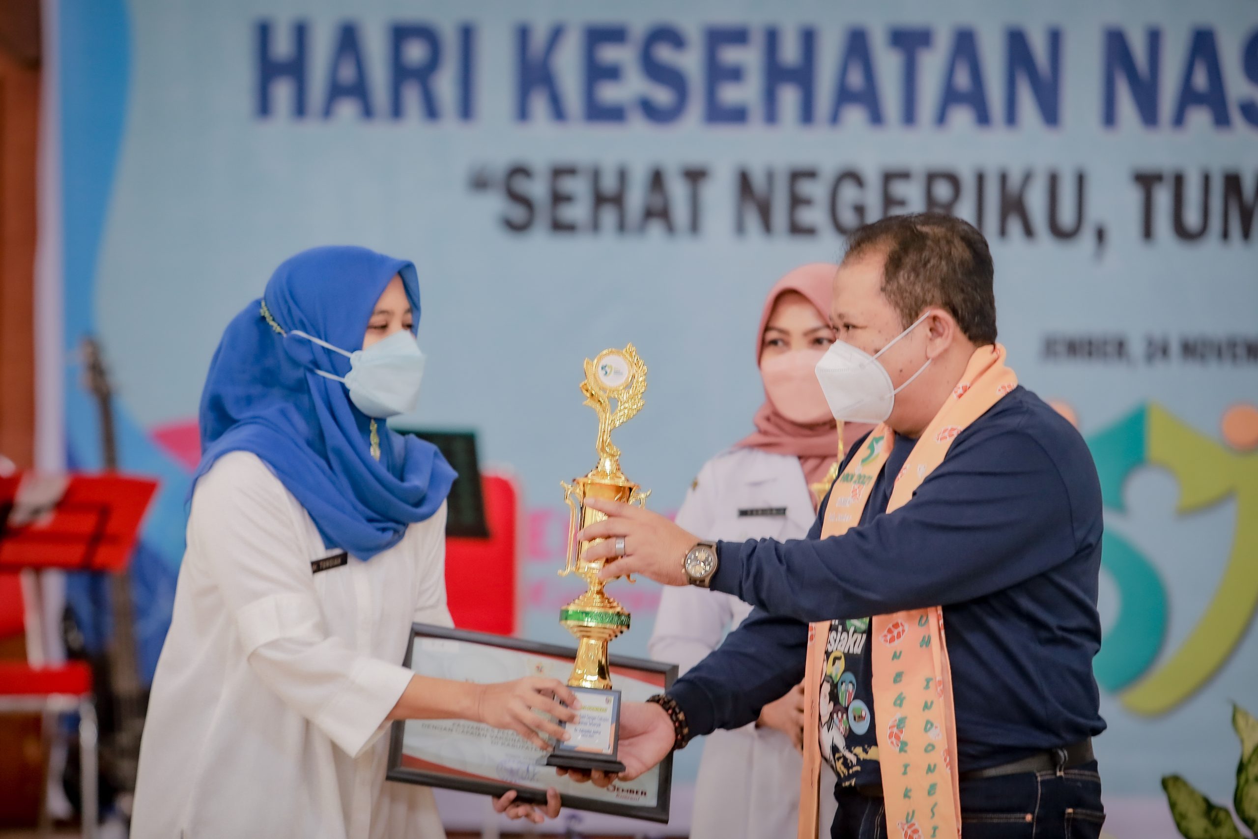 JEMBER, Peringati Hari Kesehatan Nasional (HKN) ke 57 di Aula PB. Soedirman Kantor Pemkab Jember, Bupati Jember Ir. H. Hendy Siswanto dalam pidatonya menyampaikan rasa bangga kepada seluruh tenaga kesehatan dan relawan yang selama ini telah berjuang demi warga Jember menghadapi pandemi Covid-19, Rabu (24/11/2021).
