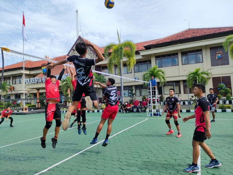 BANYUWANGI - Lapangan bola volly Polresta Banyuwangi dijadikan tempat latih tanding tim bola volly putra Kabupaten Karangasem Bali, yang melakukan latihan bersama tim bola volley putra Kabupaten Banyuwangi pada Kamis pagi (02/12/2021).