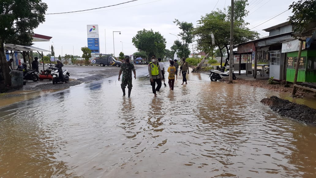 Beberapa anggota Polsek Jrengik terlihat melaksanakan pengaturan arus lalu lintas di jalan raya yang masih tergenang air sekaligus memberi himbauan kepada pengendara sepeda motor untuk berhati-hati agar mesin kendaraannya tidak mogok akibat kemasukan air.