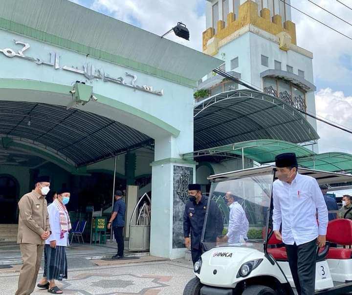 Presiden tiba di Pendopo Wedya Graha, Kabupaten Ngawi sekitar pukul 11.30 WIB lalu menuju Masjid Agung Baiturrahman yang terletak sekitar 400 meter dari pendopo. Presiden tampak mengendarai mobil golf dengan didampingi oleh Menteri Sekretaris Negara Pratikno dan Bupati Ngawi Ony Anwar.