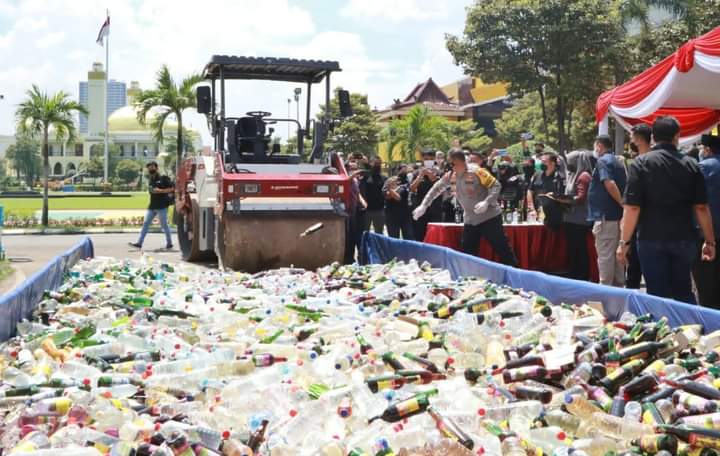 ARTIK.ID - Polda Jawa Timur bersama Badan Narkotika Nasional Provinsi (BNNP) Jawa Timur, serta stakeholder, tokoh agama dan tokoh masyarakat di Jawa Timur, jelang perayaan Natal dan tahun baru (Nataru), melakukan pemusnahkan barang bukti Narkoba dan Minuman Keras (Miras) di depan parkir PJR Mapolda Jawa Timur, Kamis (23/12/2021) siang. Pemusnahan ini sebagai realisasi tugas Polri dalam pengungkapan kasus narkoba.