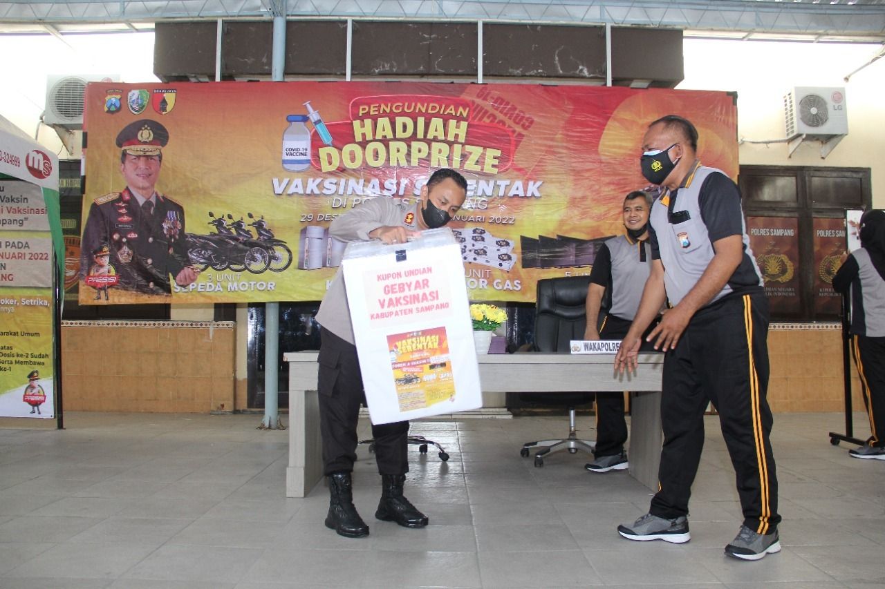 Kasi Humas Polres Sampang Iptu Sunarno SH selesai pelaksanaan undian mengatakan bahwa ada 181369 warga masyarakat Kabupaten Sampang yang mengikuti undian hadiah doorprize vaksinasi serentak di Polres Sampang.