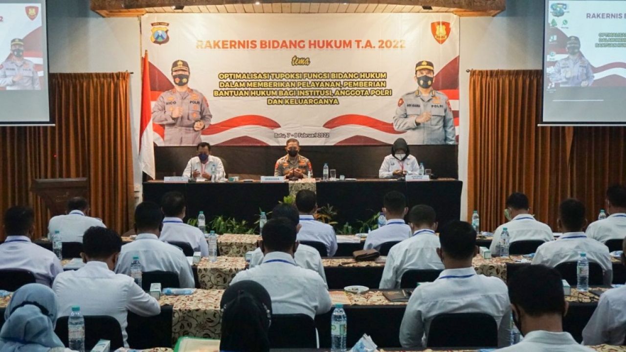 Kapolda Jatim Irjen Pol. Nico Afinta diwakili Irwasda Polda Jatim Kombes Pol. Mohamad Aris melaksanakan kegiatan Pembukaan Rapat Kerja Teknis (Rakernis) Bidang Hukum tahun 2022 dengan tema Optimalisasi Tupoksi Fungsi Bidang Hukum Dalam Memberikan Pelayanan, Pemberian Bantuan Hukum Bagi Institusi, Anggota Polri dan Keluarganya di Kusuma Agrowisata, Kelurahan Ngaglik, Kecamatan Batu, Kota Batu, Senin (7/2/2022).