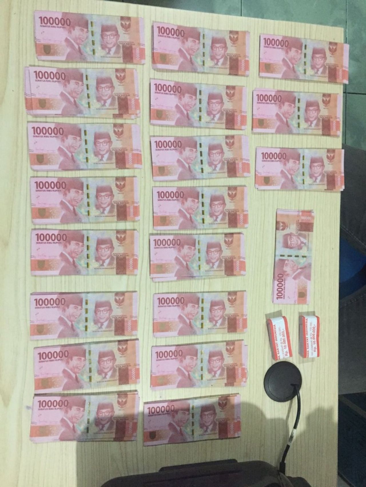 Dari mengamankan kedua tersangka didapatkan beberapa barang bukti, Uang palsu pecahan 100 ribu rupiah sebanyak 197 lembar, (Rp. 19.700.000). Tersangka dan barang bukti diamankan di Polsek Tegalsari Surabaya untuk pengembangan lebih lanjut.
