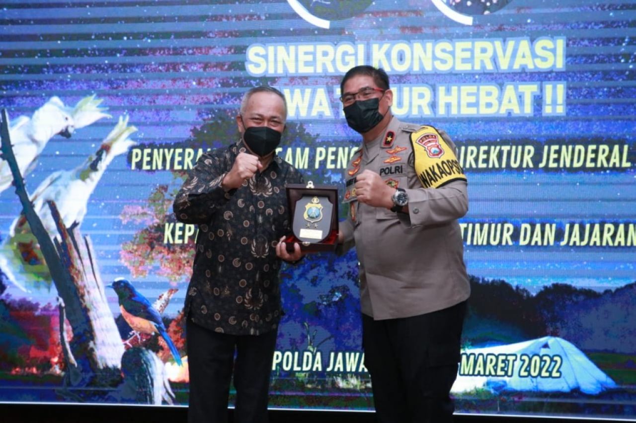 SURABAYA | ARTIK.ID - Direktur Jenderal Konservasi Sumber Daya Alam dan Ekosistem (KSDAE) memberikan penghargaan pada Kapolda Jawa Timur dan jajaran tahun 2022, pada Selasa (22/3/2022) di Gedung Patuh Mapolda Jawa Timur, atas penegakan hukum dalam penanganan kasus tindak pidana satwa liar di Provinsi Jawa Timur.