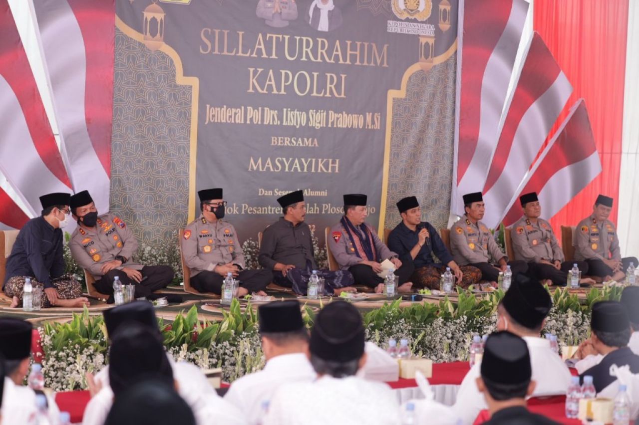 KEDIRI | ARTIK.ID - Kapolri Jenderal Listyo Sigit Prabowo beserta rombongan diantaranya Asrena Kapolri Irjen Pol Wahyu Hadiningrat, As SDM Kapolri Irjen Pol Wahyu Widada, Aslog Kapolri Irjen Pol R.P Argo Yuwono dan Dirtipidsiber Bareskrim Polri Brigjen Asep Edi Suheri dengan didampingi Kapolda Jatim Irjen Pol Nico Afinta serta pejabat utama Polda Jatim bersilaturahmi bersama Masyayikh dan sesepuh serta pengasuh Pondok Pesantren (Ponpes) Al Falah Ploso Kabupaten Kediri. Sabtu (6/8/2022).
