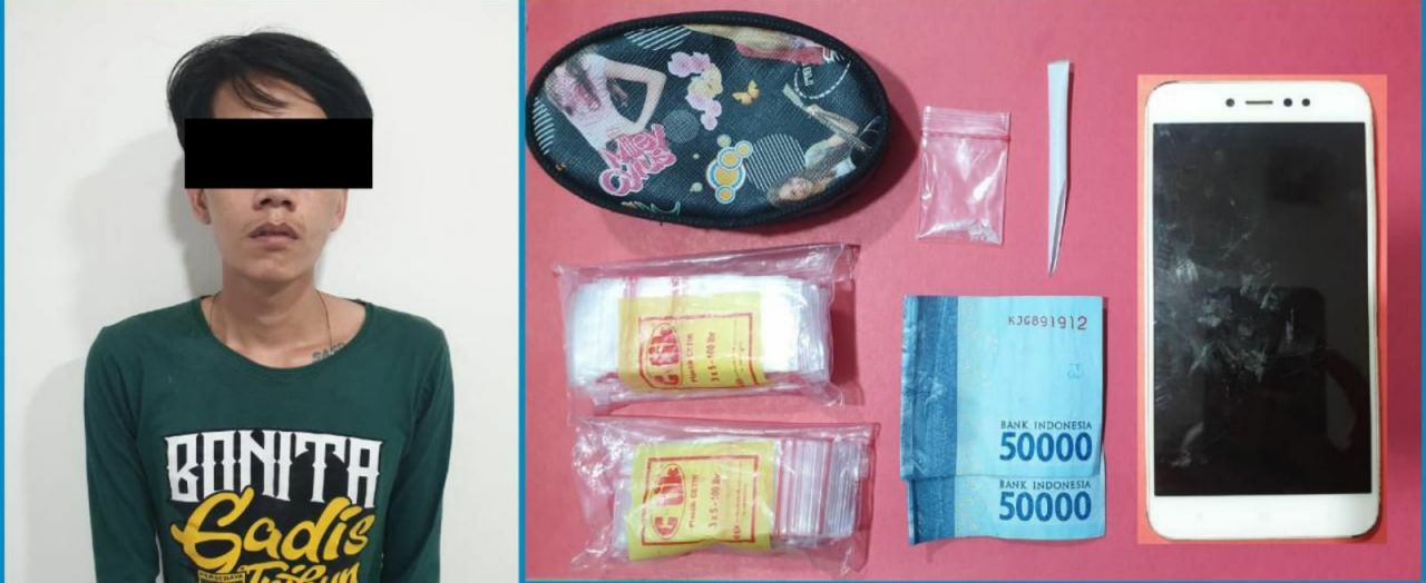 Dari tangan tersangka, satu klip bening berisikan sabu memiliknya total berat 0,38 gram, satu dompet kecil warna hitam, 2 bendel klip plastik kosong, 1 buah sekrop dari sedotan warna putih, uang tunai sebanyak Rp. 100.000, dan unit handphone.