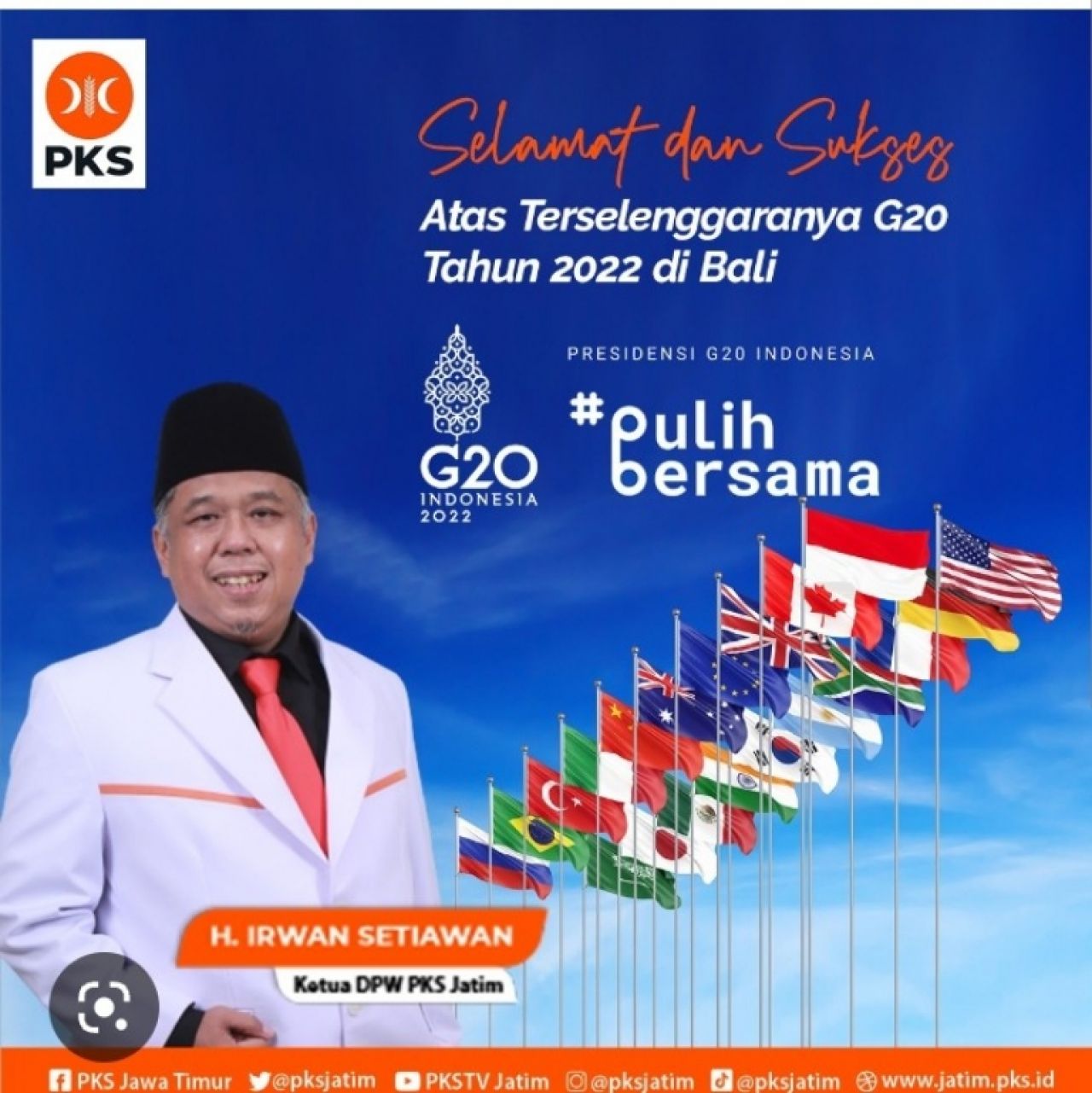 "Saya Irwan Setiawan Ketua DPW PKS Jatim mengucapkan selamat dan sukses atas terselenggaranya KTT G20 di Bali, semoga dengan terselenggaranya Konferensi ini bisa kembali pulih bersama dan menguatkan Ketahanan Ekonomi Nasional Indonesia Bangkit.