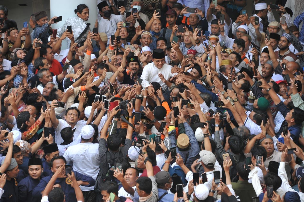 Ribuan loyalis tampak menunggu di luar masjid sejak pagi. Usai Salat Jumat, Anies yang keluar dari pintu depan masjid langsung disambut relawan yang berada di jalan raya depan masjid. Teriakan Anies Presiden pun bergemuruh.