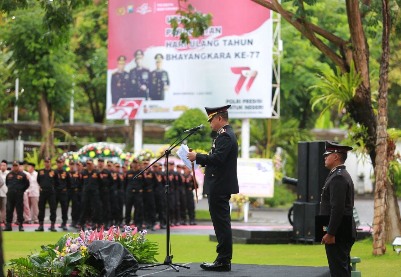 Peringatan HUT Polri tahun ini mengangkat tema "Polri Presisi untuk Negeri, Pemilu Damai Menuju Indonesia Maju". Upacara tersebut diikuti oleh ratusan peserta dari unsur TNI, Polri, Satpol PP dan Dinas Perhubungan.