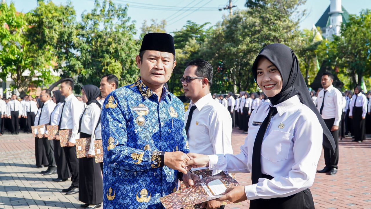 LAMONGAN | ARTIK.ID - Bupati Lamongan, Yuhronur Efendi, menyerahkan surat keputusan (SK) kepada 980 Pegawai Pemerintah dengan Perjanjian Kerja (PPPK) jabatan fungsional guru formasi 2022, Senin (17/7/2023), di halaman Pemkab Lamongan.