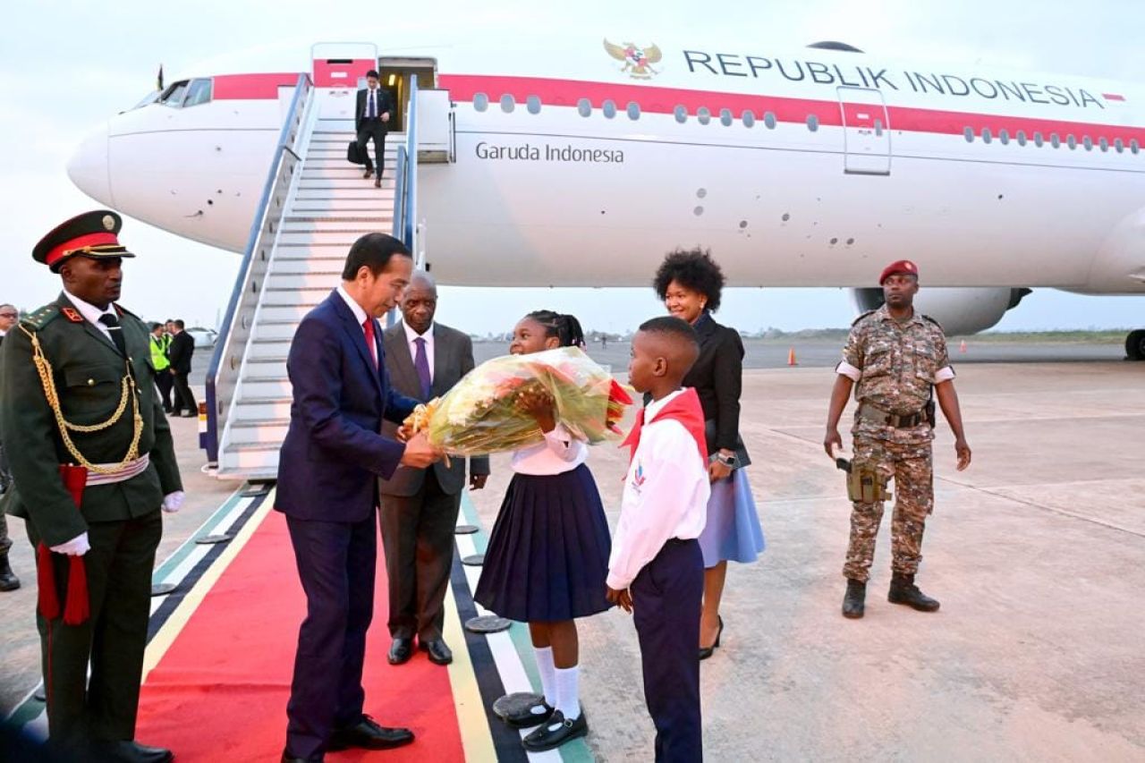 Pesawat Garuda Indonesia (GIA-1) yang membawa Presiden Jokowi bersama rombongan tiba di Bandar Udara Internasional Maputo sekira pukul 17.00 waktu setempat (WS) atau pukul 22.00 WIB.