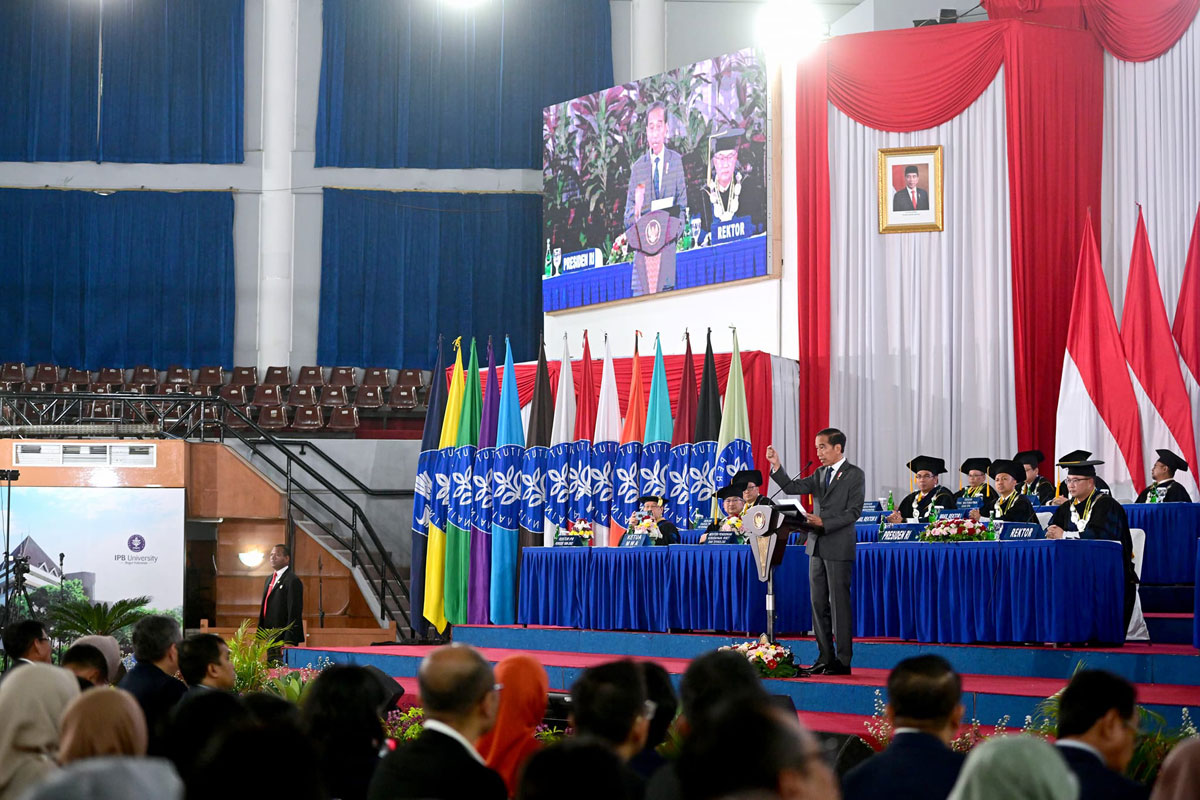 “Dengan tantangan-tantangan yang ada tadi, kita perlu inovasi besar-besaran yang bisa menjadi terobosan, yang bisa menjadi langkah besar kita ke depan itu seperti apa untuk menjadikan permasalahan pangan dunia sebagai peluang Indonesia untuk menjadi lumbung pangan. Ada kesulitan, ada krisis, tapi itu juga bisa menjadi sebuah peluang, bisa menjadi sebuah kesempatan sehingga nantinya bisa justru meningkatkan kesejahteraan petani kita, menyejahterakan nelayan kita,” ujar Presiden di Gedung Grha Widya Wisuda, Kampus IPB Dramaga, Kabupaten Bogor, Provinsi Jawa Barat, pada Jumat, 15 September 2023.